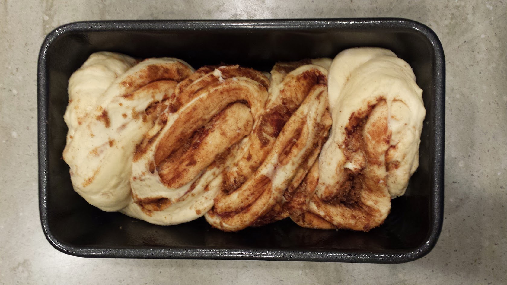 Cut the dough in half down the length of the roll, so the filling layers are exposed, and rotate each half so the cut side is facing up. Twist the two halves around each other, trying to keep the cut sides up. Carefully lift and place into the prepared pan, tucking the ends under to get it to fit. Don’t worry if it looks messy – it’ll be beautiful and taste great once baked.