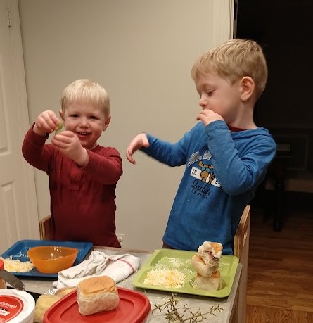 Bobby, age 5, eating a stack of bread along with shredded cheese by the handful.